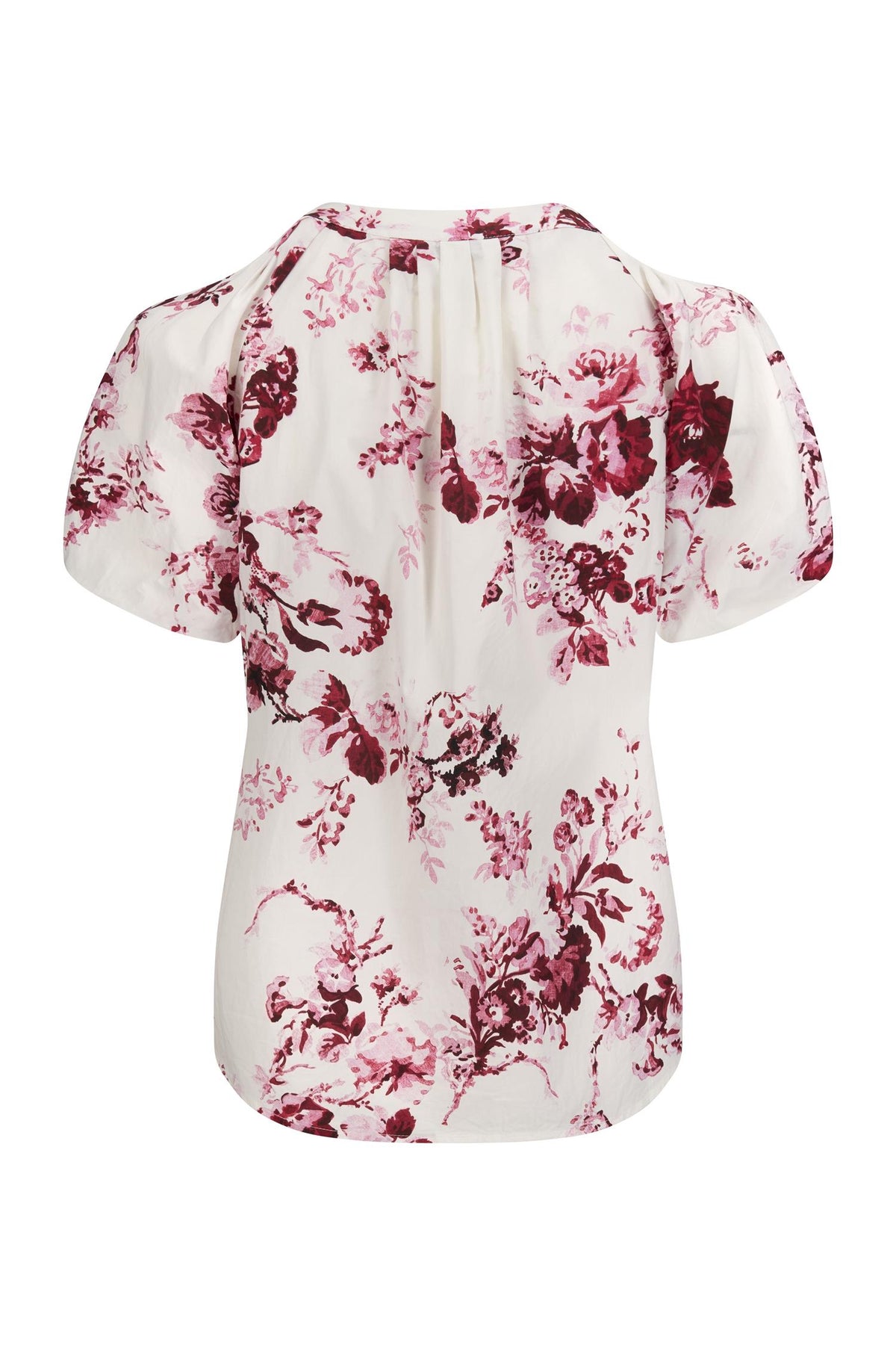 Blusen har kort erm og V-utringning. Raglandsfelling gjør at den sitter pent, og passer mange. Rett i fasongen, med lengde til hofte.