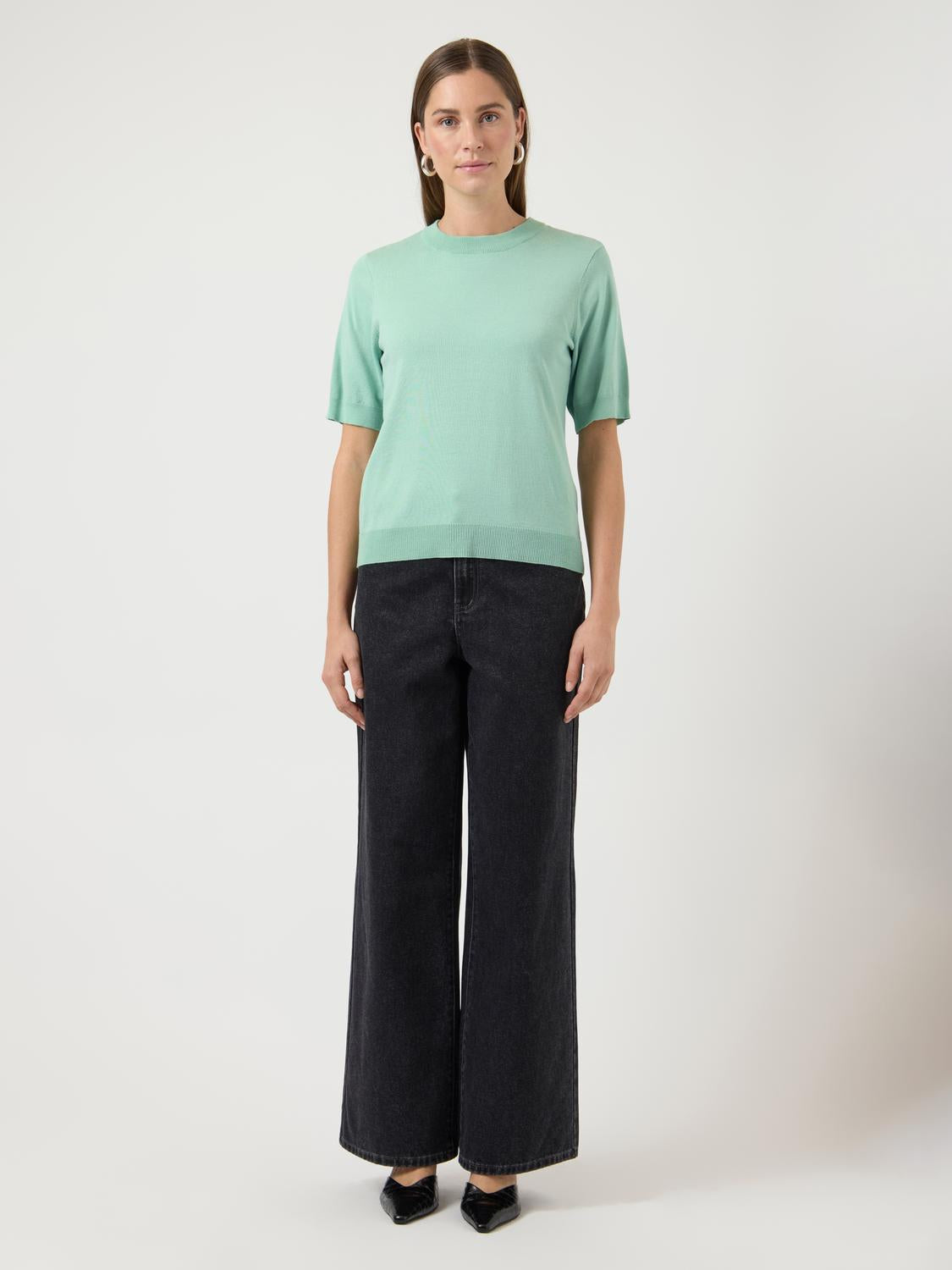 YASLENA SS KNIT PULLOVER S. NOOS er en stilren og komfortabel strikket topp laget av en myk viskoseblanding. Den har en O-hals og korte ermer, perfekt for en avslappet stil. Den ribbede mansjetten gir et moderne preg, og den regulære passformen gjør den lett å style med ulike antrekk.