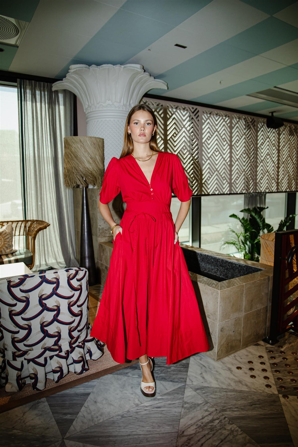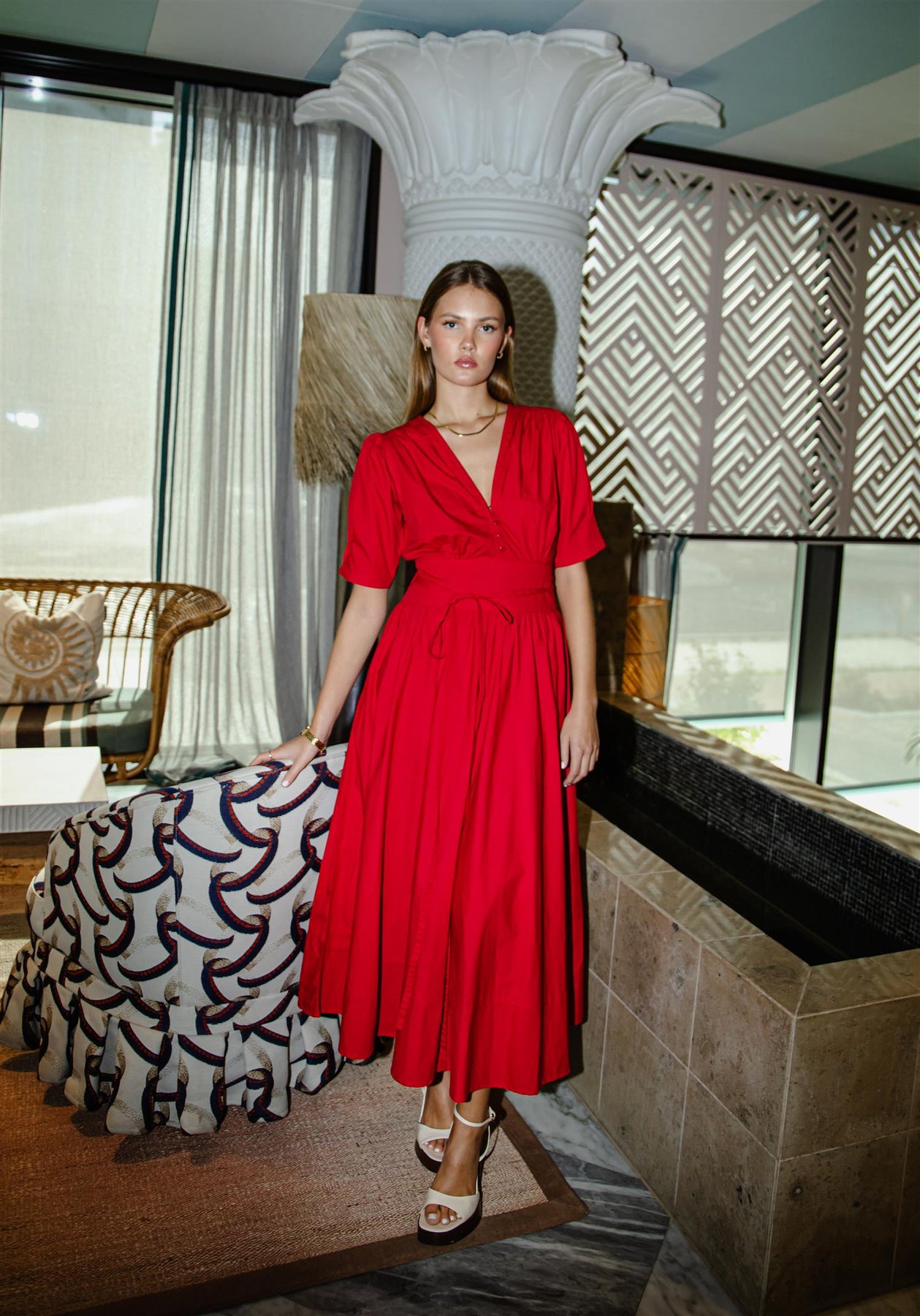 Maria Dress i City Red Poplin er en stilren og komfortabel kjole laget av 100% bomullspoplin. Denne kjolen er perfekt for hverdagsbruk og gir et friskt preg til garderoben din.