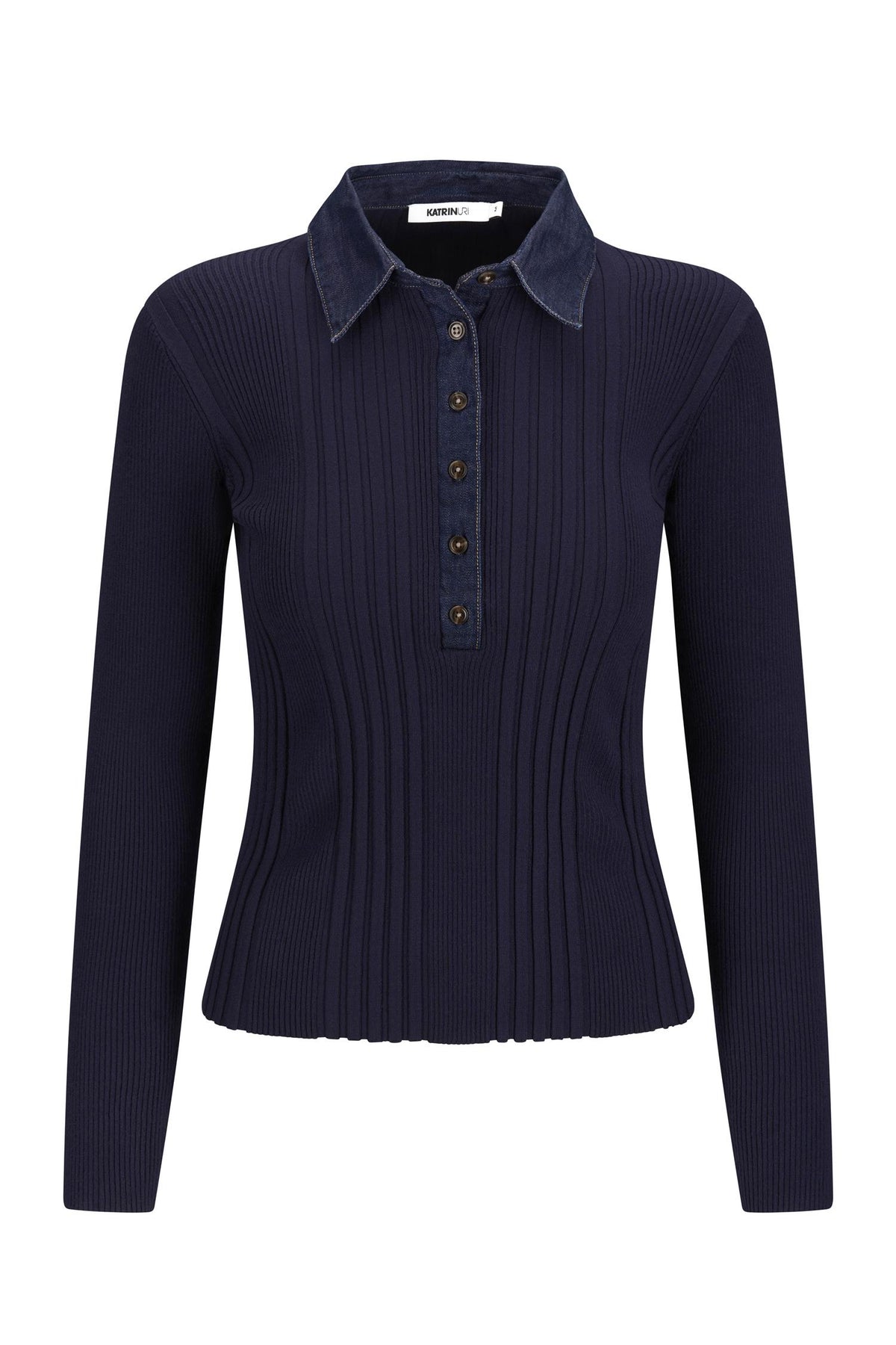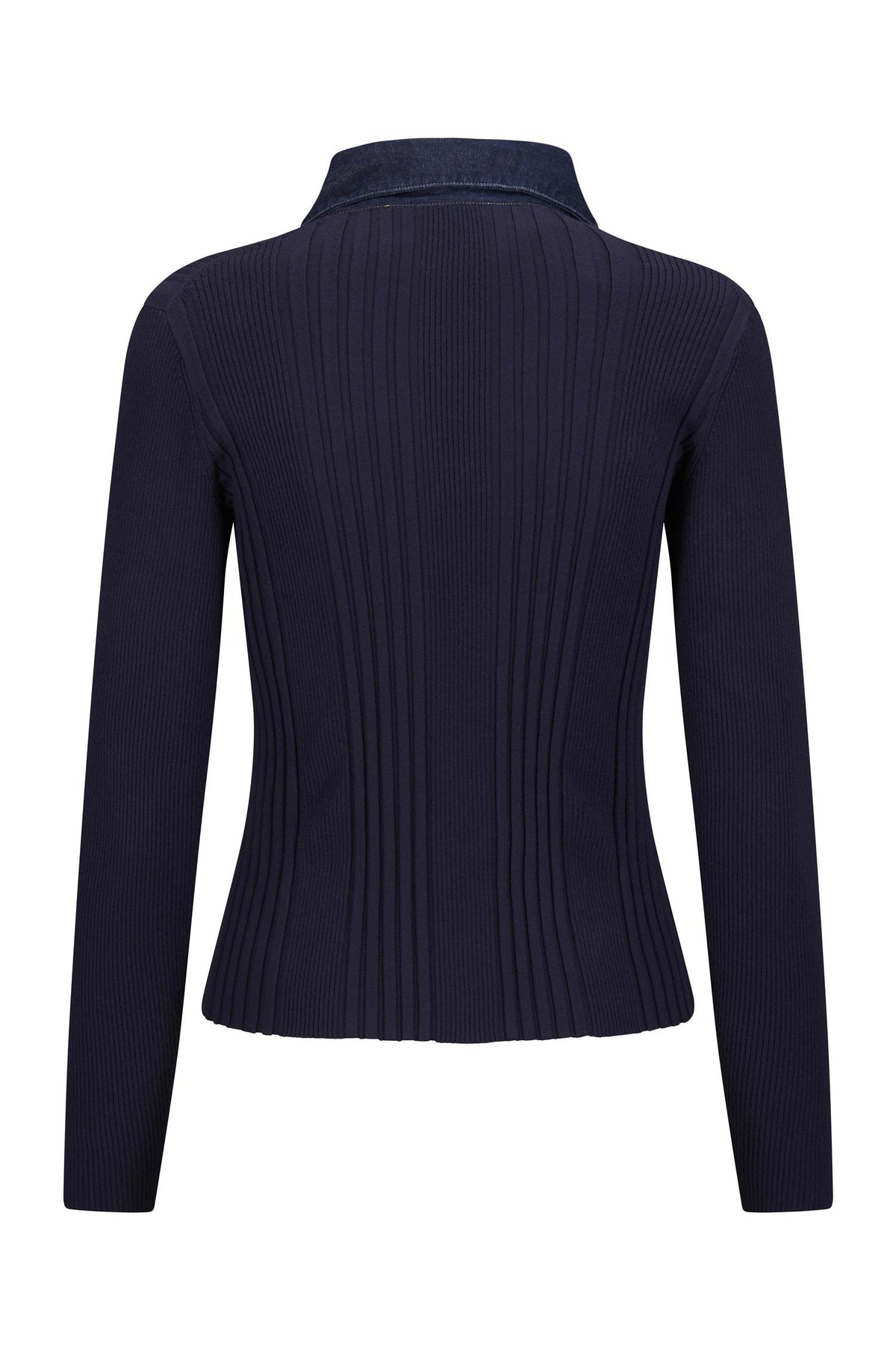 Den gode viskosegenseren har krage i denimstoff, med knepping i front. Er strikket i smal rillestrikk, er vanlig i størrelse, smal fasong.