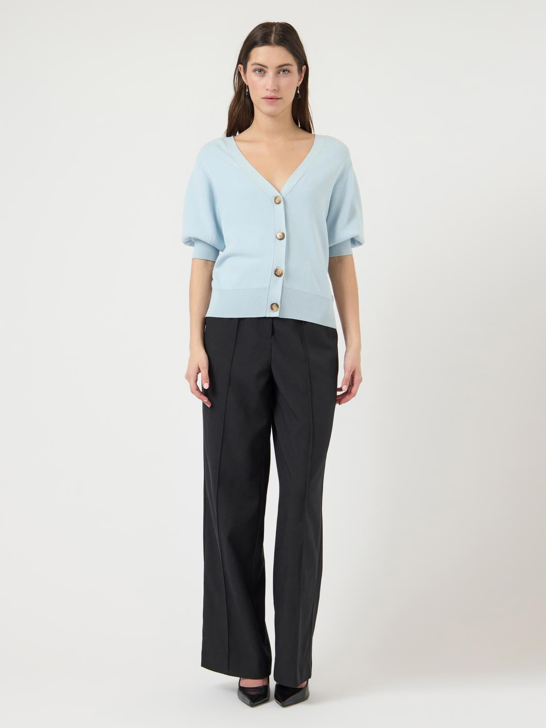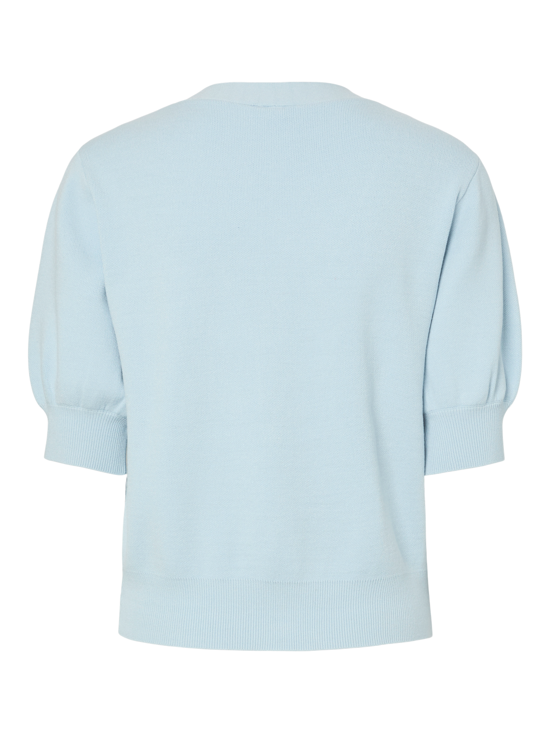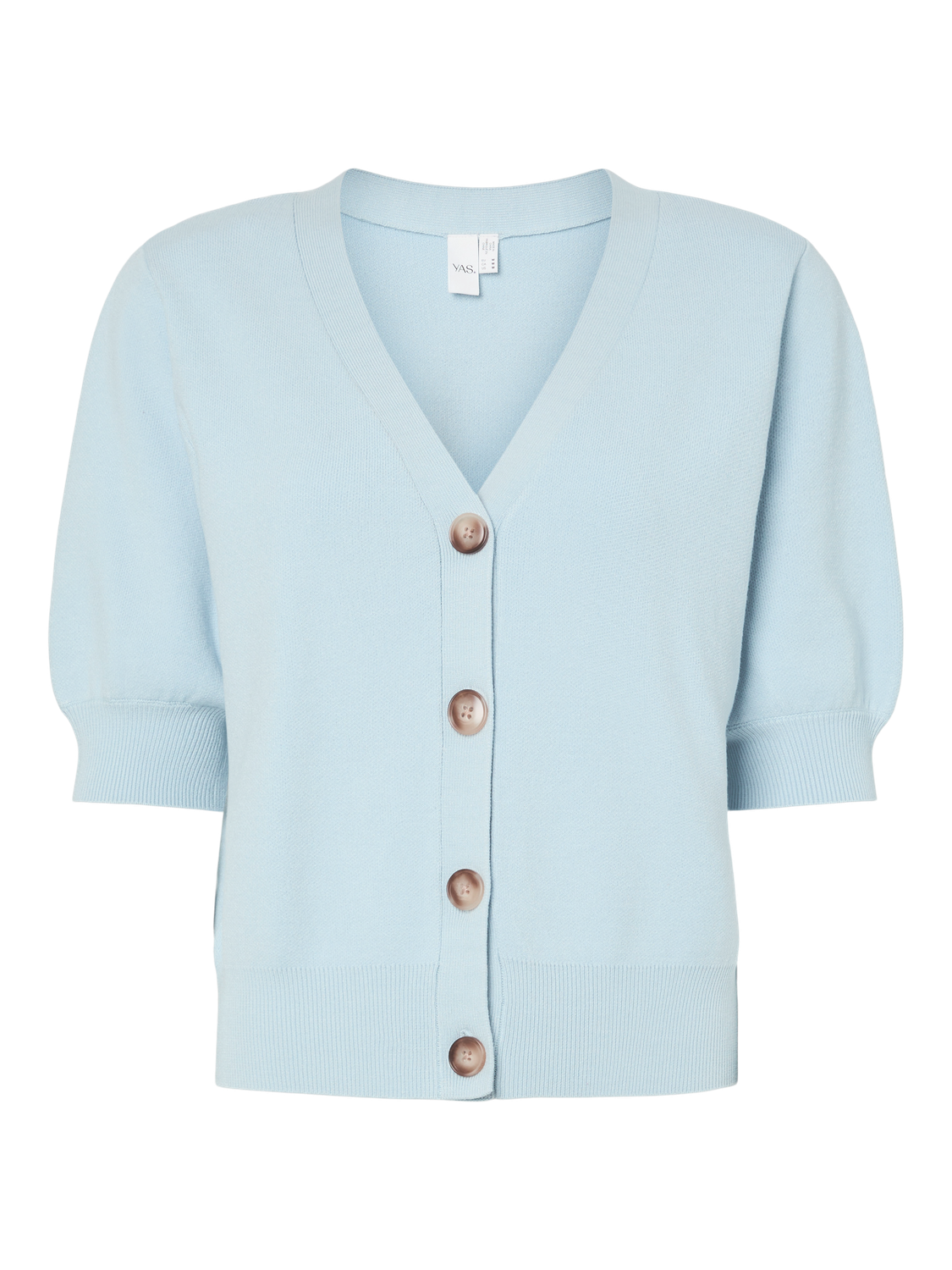 YASFONNY 2/4 strikket cardigan i en nydelig mellomblå farge er laget av en myk viskoseblanding som gir en behagelig følelse mot huden. Den har en elegant V-hals, 2/4 ballongermer og ribbemansjetter, noe som gjør den til et stilig valg for enhver anledning.