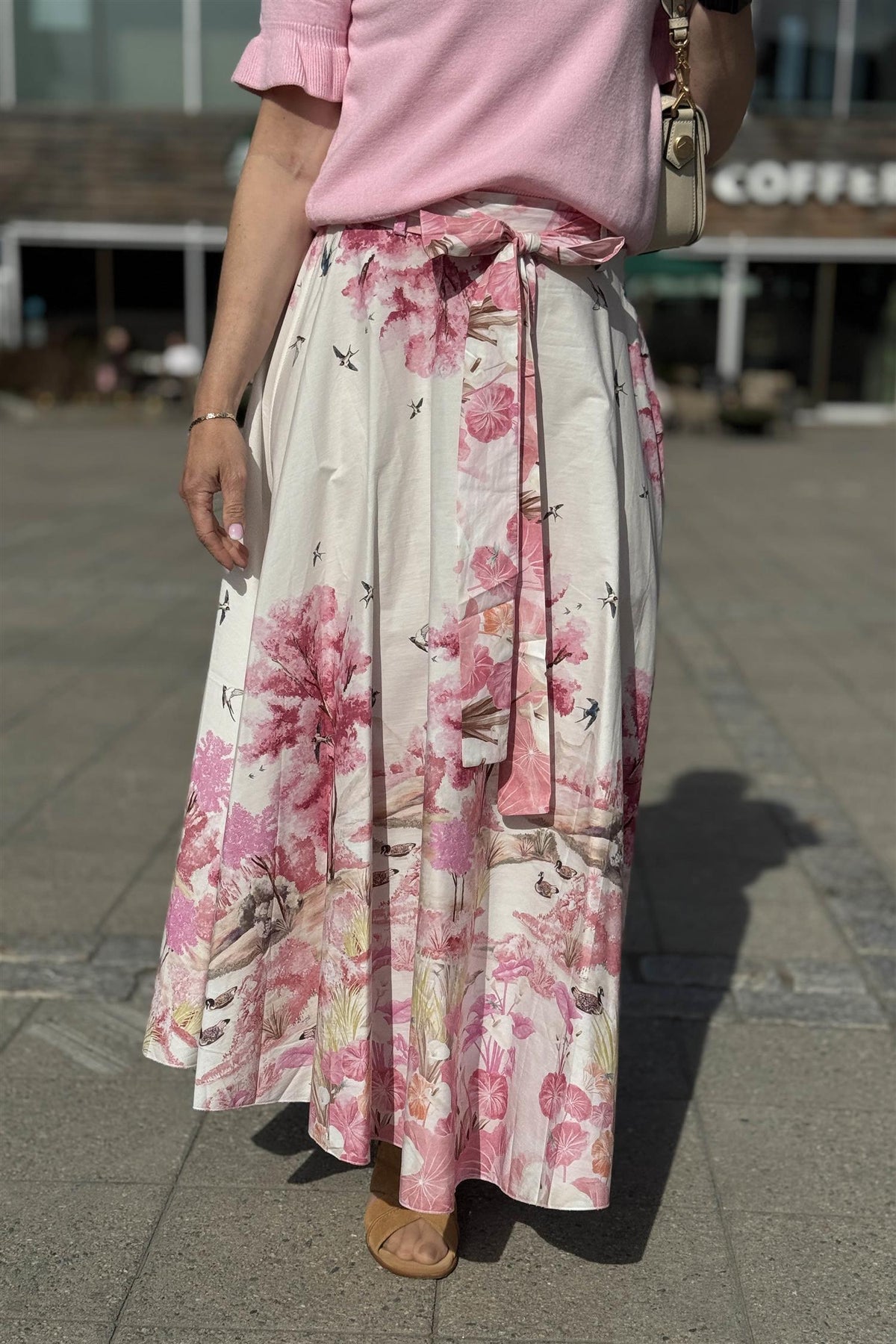 Skjørtet har lengde til ankelen, stikklommer i siden, og et knytebånd i livet. Style med en lett genser i rosatoner for et fresht sommerantrekk. Skjørtet er onesize, og vil passe fra str 36 til str 42, fordi strikken i livet er elastisk.